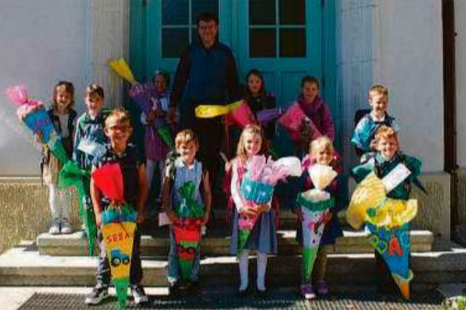 Mit ihrem Namensschild, Schulranzen und Schultüte bepackt konnten alle Kinder dann mit ihrem Klassenlehrer Herrn Ziegler schon die erste Vesperpause und die erste Unterrichtsstunde verbringen.