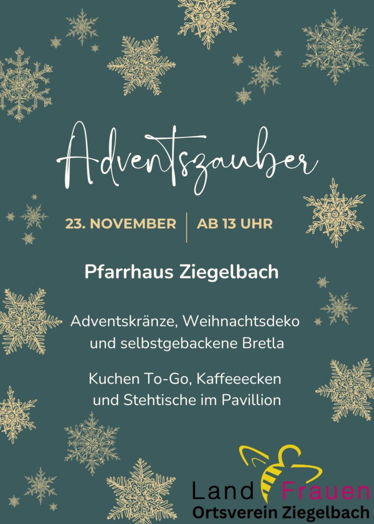 Die Land-Frauen Ziegelbach laden am 23. November ab 13 Uhr ins Pfarrhaus Ziegelbach zum Adventszauber ein.