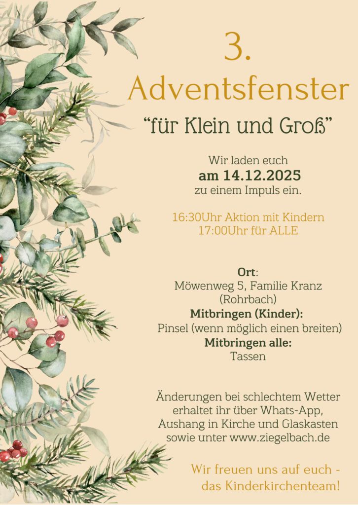 Wir laden Euch in diesem Jahr erstmalig herzlich zum Ziegelbacher Adventsfenster ein. Mit einem Impuls bringen wir uns dem Weihnachtsfest an jedem Adventssonntag ein kleines Stückchen näher.